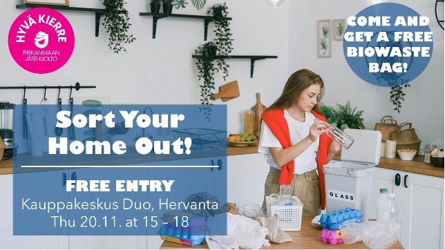 Pirkanmaan Jätehuolto, together with Ekokumppanit, is organizing the “Get Your Home Sorting in Shape!” event on Thursday, November 20th from 3 PM to 6 PM at Hervanta Shopping Center Duo. The event offers information about waste sorting and easy home solutions – in several languages.