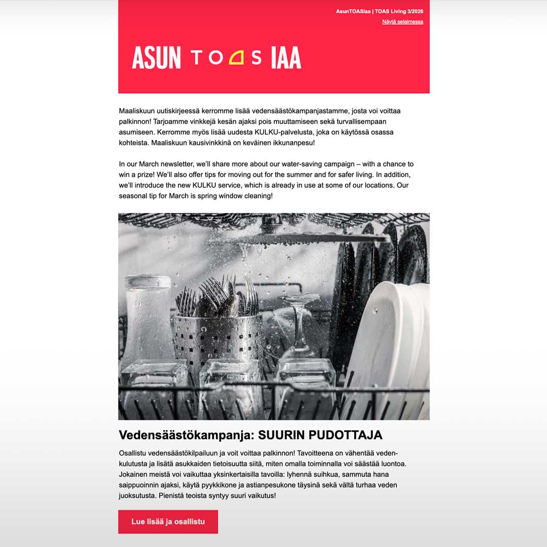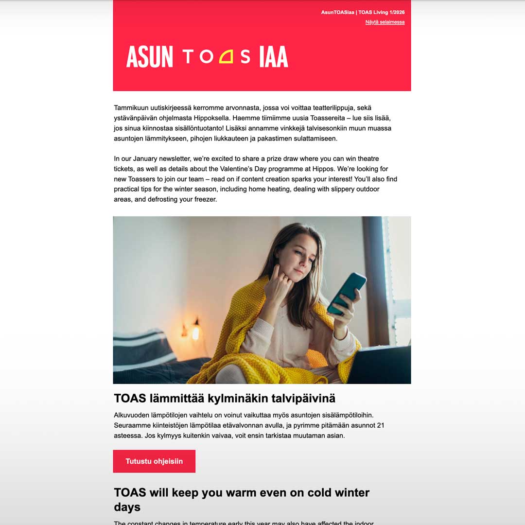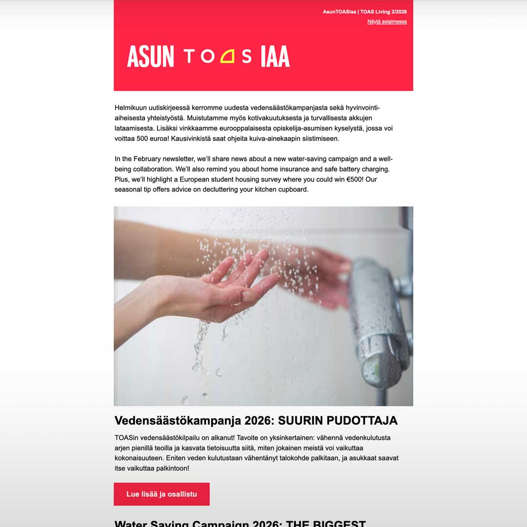 UutiskirjeemmePysy ajan tasalla asumisestasi ja TOASin kuulumisista!